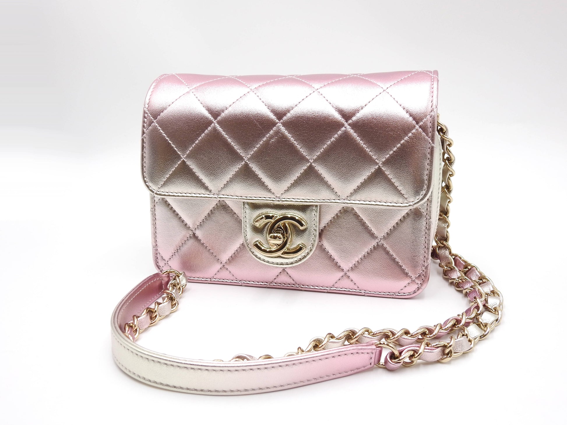 CHANEL Mini Flap Chain Shoulder Bag Lambskin Metallic Silver Pink AS3002